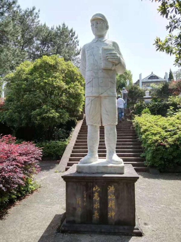 在余姚市陸埠鎮鐘山紅色主題公園內,矗立著一座雕像,戴著圓圓的眼鏡,手拿一本書籍,書生氣十足,這便是朱洪山烈士。底座上由浙江省委原書記薛駒同志題寫的“洪山精神,山高水長”,高度概括了朱洪山一生的英勇事跡,像大山一樣永遠存在被后人敬仰。
