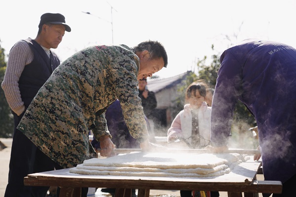在浙江省永康市,村民們搶抓晴好天氣將抽好的土索面拿出來晾曬,咸香味四溢。(浙江省永康市紀委監委供 胡華超 攝)